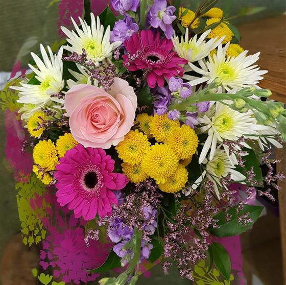 This bouquet is gift wrapped in cellophane and finished with a bow