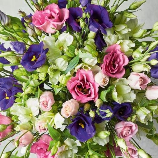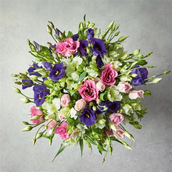 A hand tied bouquet, aqua or basket of Alstromeria and Lisianthus & foliage in mixed shades. Arranged by florists for you.