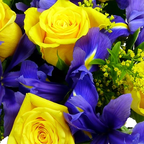 A hand tied bouquet, aqua or basket of flowers & foliage in shades of blues & yellows. Arranged by florists for you.