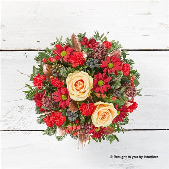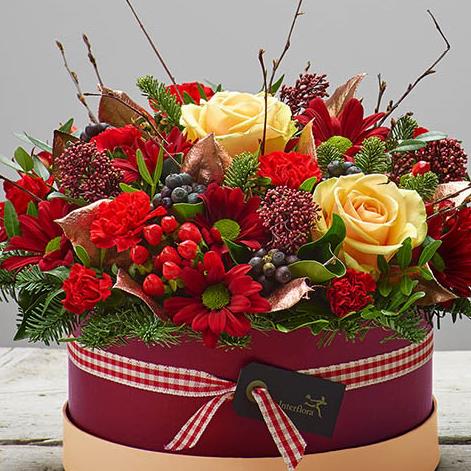 Peach large headed roses, red spray carnations, red spray chrysanthemums, red hypericum, berried ivy, copper salal, burgundy skimmia, spruce, birch and pistache, arranged in a red hatbox trimmed with ribbon.