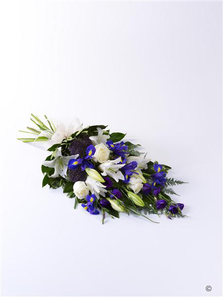 The soft blue shades of iris are complemented by white Oriental liles, white large-headed roses and blue lisianthus in this classic sheaf, which is tied together with a cream ribbon.
