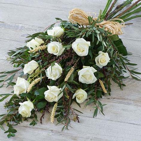 A dozen roses contrast beautifully with silvery eucalyptus foliage and natural elements including dried wheat, natural birch and a raffia bow.