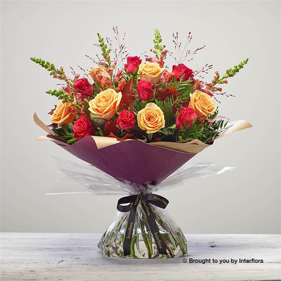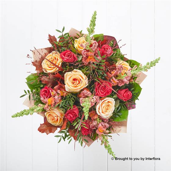 Featuring orange antirrhinum, cersie roses, peach large headed roses, with panicum grass, oak leaf, pistache and salal, hand-tied, wrapped and presented in Interflora gift packaging.