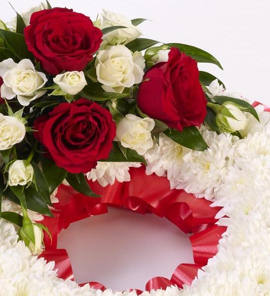 A classic circular wreath covered with a mass of white double spray chrysanthemums and finished with a red and white spray of roses and spray roses and finished with a red ribbon trim. Approximate diameter 50cm (19 inches).