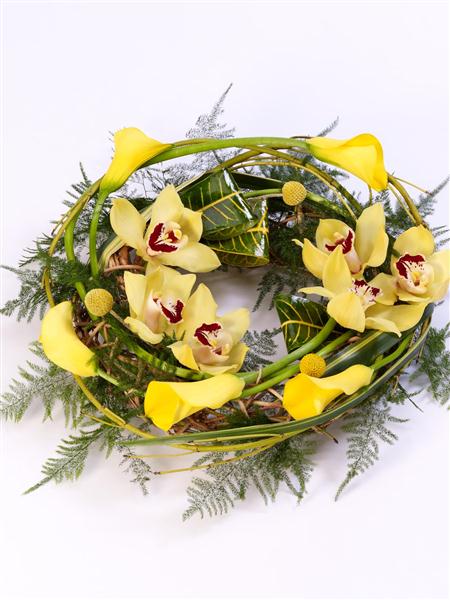 Yellow calla Lily and cymbidium orchids are entwined with cornus Stems, craspedia and asparagus fern around a circular willow frame to create this woodland wreath. Approximate diameter 60cm (23 inches).