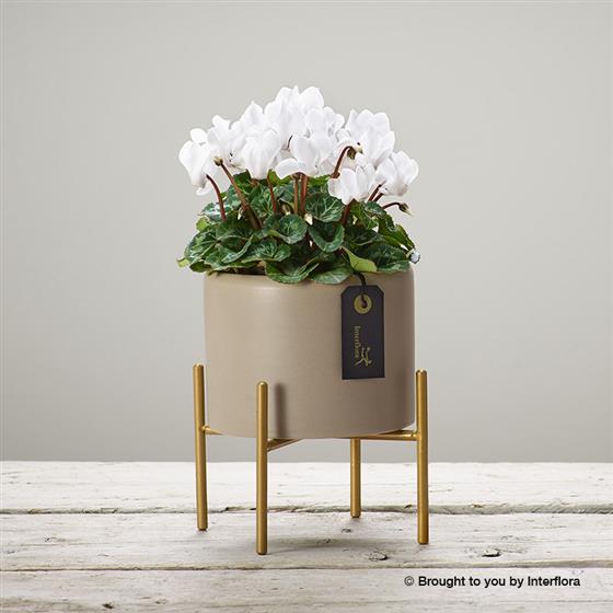 Featuring a white cyclamen planted in a grey ceramic pot on a gold stand.