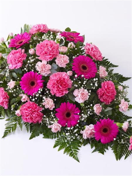 This traditional floral spray in varying shades of pink includes bright cerise germini plus light and dark pink carnations. These fresh flowers are carefully arranged and interspersed with white gypsophila, leather leaf and eucalyptus.