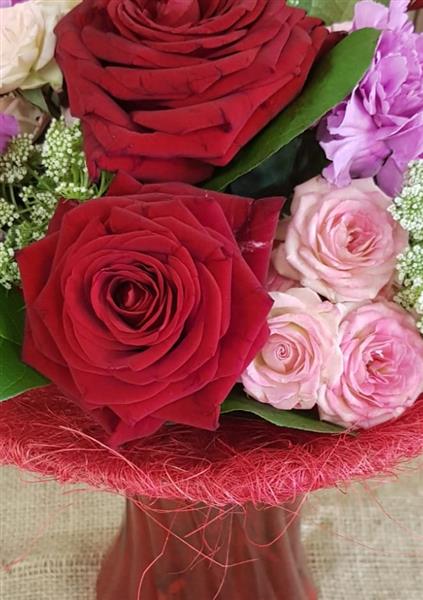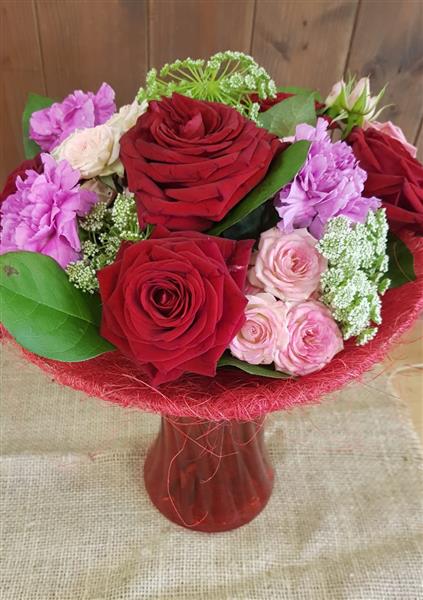 Stunning Arrangement of Red Roses, Spray Roses, Ammi and Fuschia Carnations beautifully presented in a red vase with red collar.