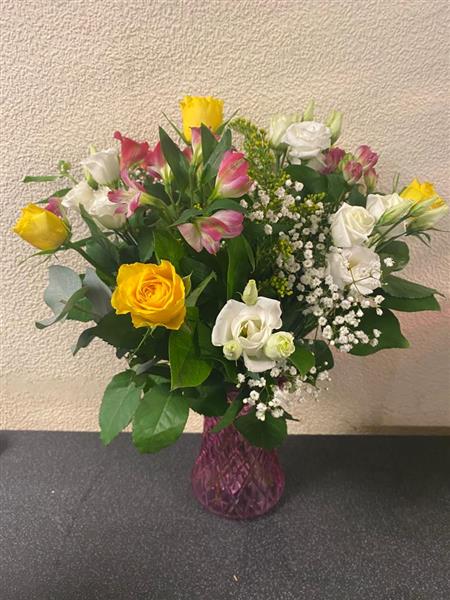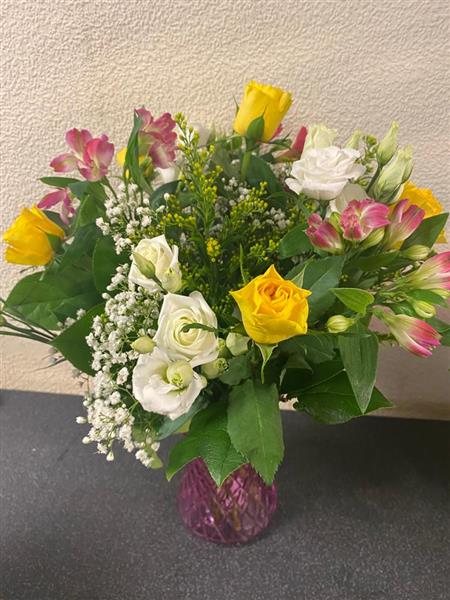 Bright Lemons inspired this beautiful vase arrangement. The beautiful Yellow Roses stand out against the Bold Cerise and compliment the Solidago perfectly.
