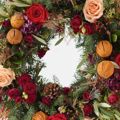 Make theirs a wreath to remember. This gorgeous Christmas door wreath will be packed with fresh festive flowers, expertly arranged and delivered with care by their local florist. It'll feature fresh blooms in shades of red and green, with peach and cream highlights and pops of burgundy and cerise.