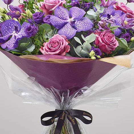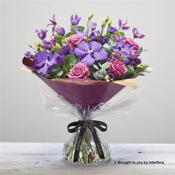 Featuring lilac large headed roses, blue vanda orchids, purple lisianthus and purple clematis with pistache, eucalyptus and salal hand-tied, wrapped and presented in Interflora gift packaging.