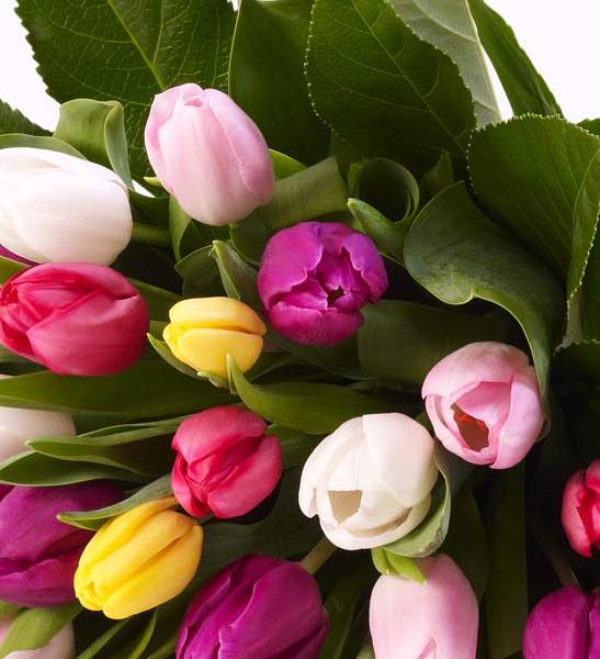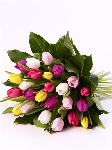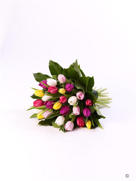A beautiful selection of tulips in mixed colours are tied together with fatsia and aspidistra leaves to create this unusual Tulip sheaf.