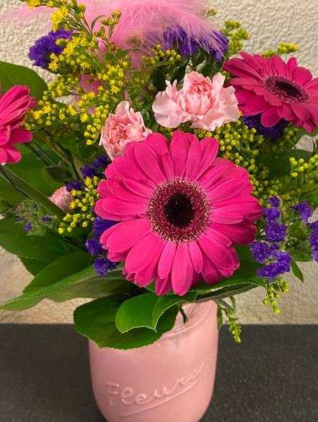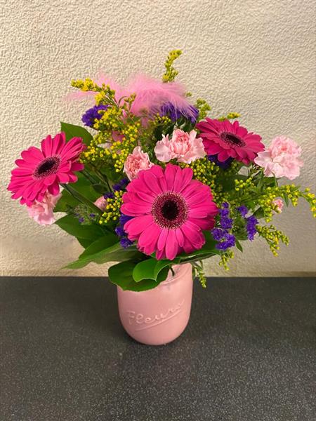 Treat your Mum to something special this Mother's Day with this beautiful bouquet in a vase. Consisting of Cerise Germini, Solidago, Spray Carnations and Statice. This gift is perfect to give this Mother's Day.