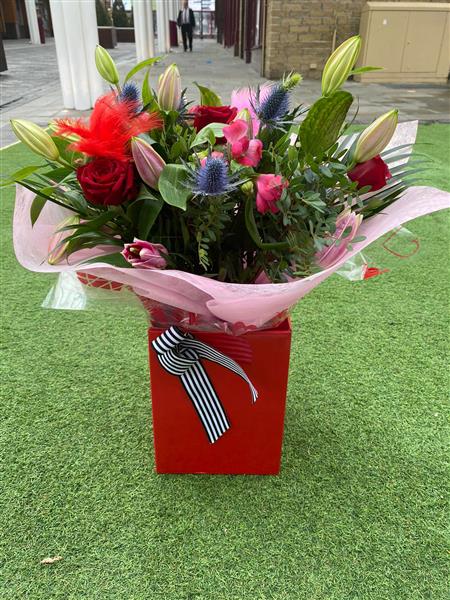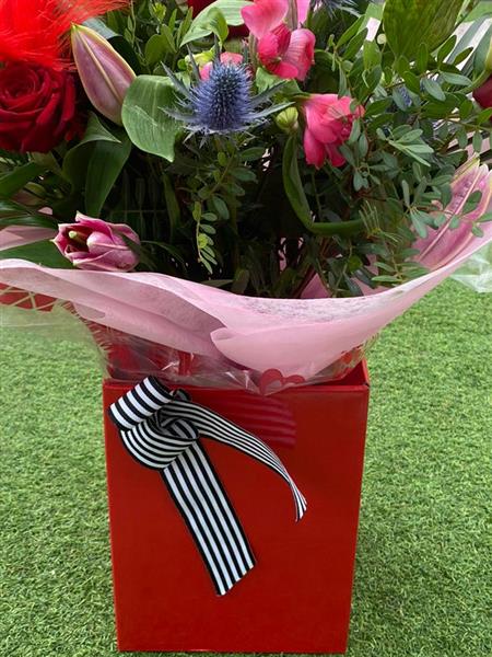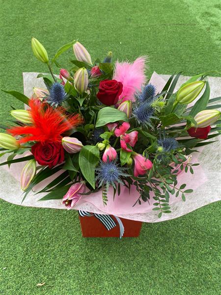 A Luxury bouquet filled with textured and lush foliage. 3 Large headed Red Roses and 4 Oriental Lilies. Along with Blue Eryngium and a pink and red feather pick to compliment.