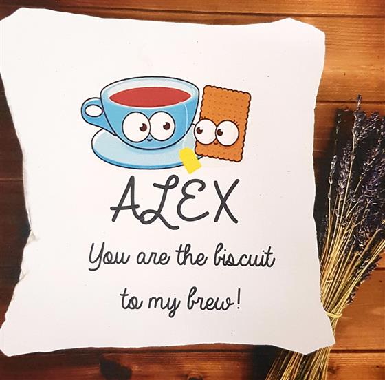 Handmade cushion adorned with a cute cup and biscuit design; personalise with the name of your choosing.