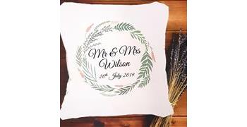 Handmade cushion with a lovely pastel wreath design and personalised with the titles and date of your choosing.