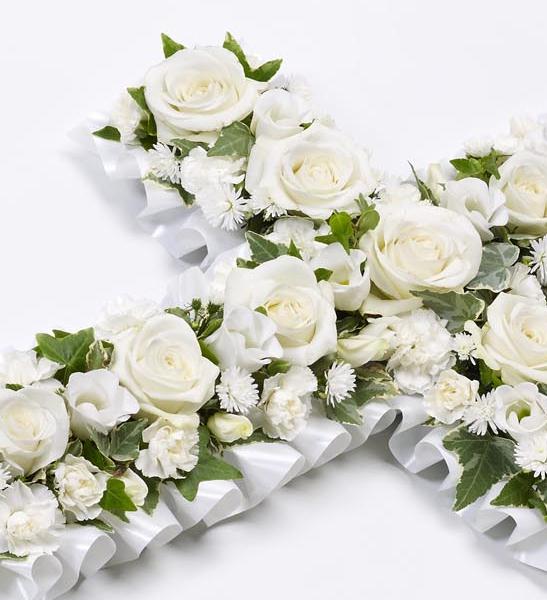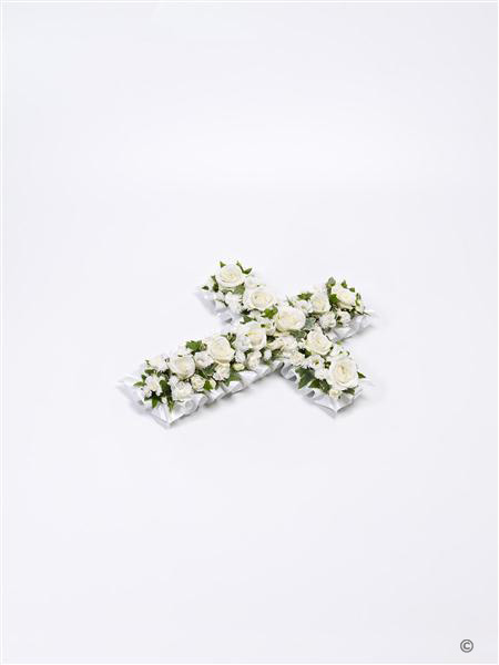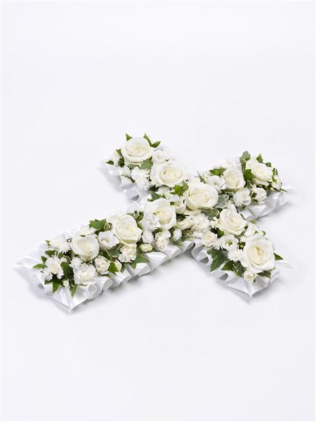 A petite cross in pure white including roses, lisianthus, spray carnations and September flower with trailing ivy and pittosporum.