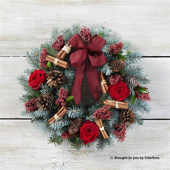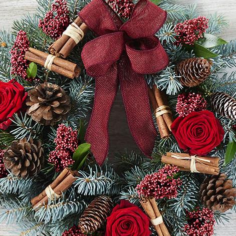 Spruce, red roses, burgundy skimmia, pine cones and cinnamom bundles, trimmed with a red ribbon.