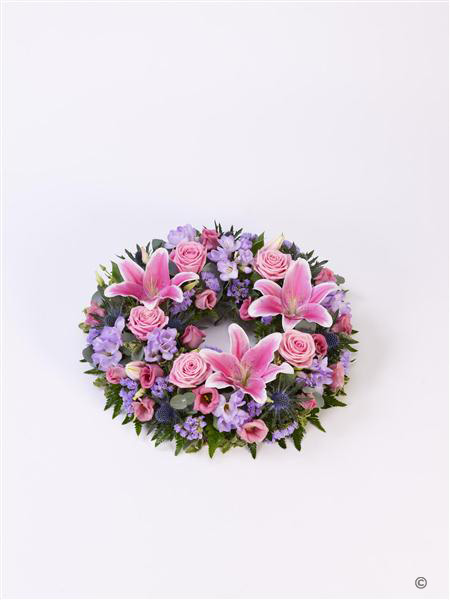 Lily and large-headed roses in pink are nestled amongst freesias and lisianthus in lilac along with blue eyngium and foliage in this circular wreath. Approximate diameter 38cm (14 inches).