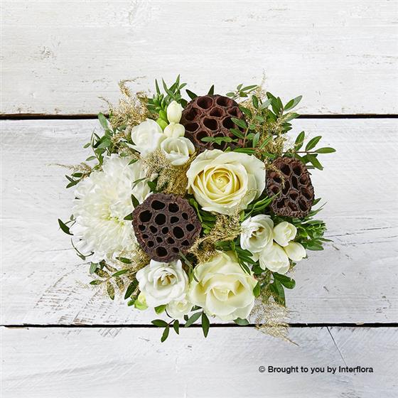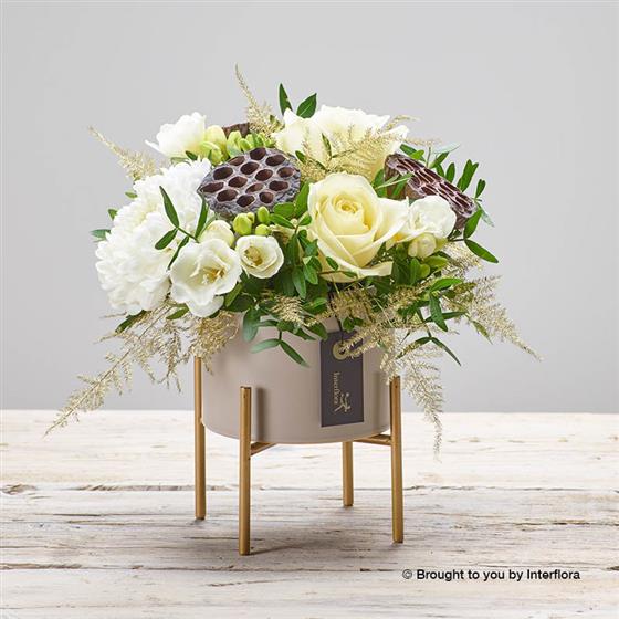 Featuring a white chrysanthemum, white large headed roses and white freesia, with pistache, gold asparagus fern and dried lotus pods, arranged in a grey ceramic pot with a gold stand.