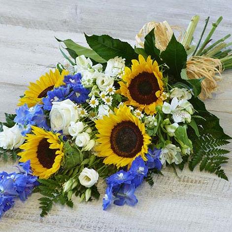 A gorgeous summery medley featuring warm sunflowers, bright blue delphiniums and white roses.
