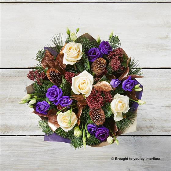 Featuring cream large headed roses, purple lisianthus, burgundy skimmia, copper salal, pine, spruce and spruce cones, hand-tied, gift wrapped and presented in a winter gift box.