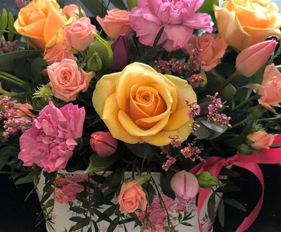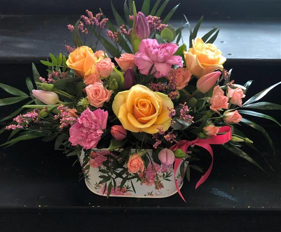 Pastel colour gorgeous stems designed in a vintage floral tin pot. Including peach "Alchemy" Roses, pink Carnations, pink Spray Roses, mixture of Tulips and touch of pink Limonium and finished with lush greenery.